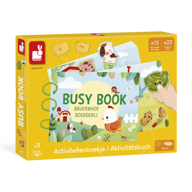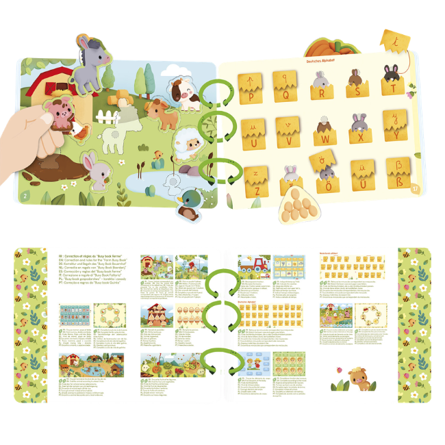 Een leerzaam boek met een boerderijthema, gepresenteerd in een mooie geschenkdoos. Het bevat 20 pagina's vol leuke activiteiten. Peuters ontdekken boerderijdieren, hun leefomgeving, de levenscyclus van een kip, fruit en groenten uit de tuin... terwijl oudere kinderen spelenderwijs cijfers en het alfabet (kleine en hoofdletters) leren. Dankzij drie afneembare plastic ringen kunnen ouders de inhoud van het boek aanpassen door pagina's te selecteren die geschikt zijn voor de leeftijd van het kind. Bevordert de fijne motoriek en het algemene leervermogen. Gemaakt van FSC™-gecertificeerd karton.
