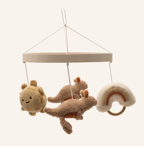 Deze leuke houten babymobiel uit het Kangaroots thema is perfect voor je kleintje. Breng warmte en geborgenheid naar de babykamer met deze leuke babymobiel. Je kunt de mobiel aan de rand van de box bevestigen voor veel speelplezier of aan de rand van het ledikantje voor het slaapritueel. Aan de houten ring hangen twee kangoeroes, een vrolijk zonnetje en een kleurrijke regenboog – allemaal zachte figuurtjes die je kleintje uitnodigen om te kijken en te ontdekken. Ook super leuk om als (kraam) cadeau te geven. Let op: houten mobiel arm niet inbegrepen.