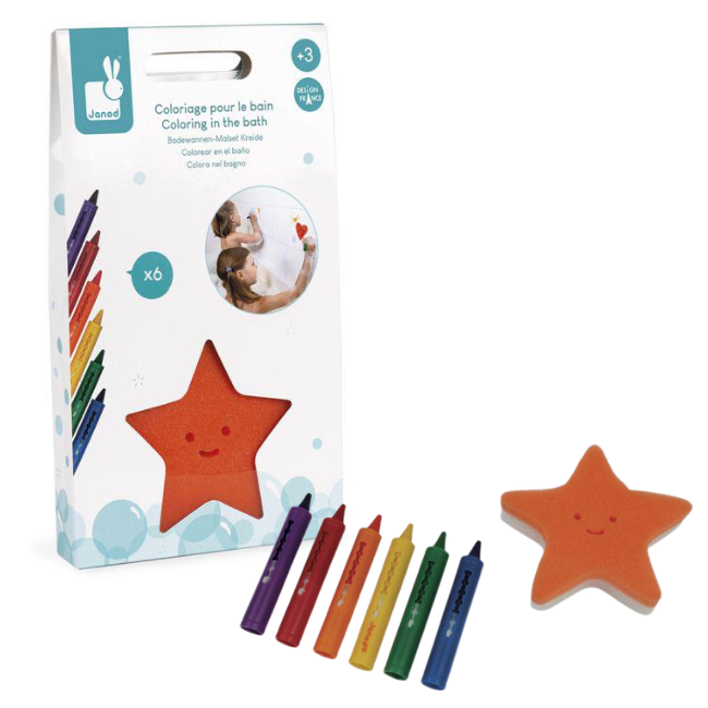 Voor kinderen vanaf 3 jaar: 6 kleurpotloden en een spons in de vorm van een zeester om in bad te tekenen, uit te gummen en eindeloos opnieuw te beginnen!