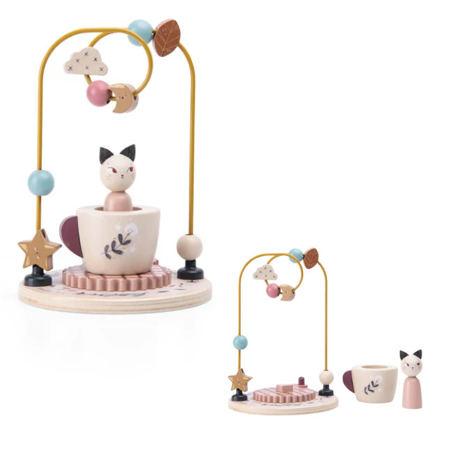 Geïllustreerd houten speelgoed uit de After the Rain-collectie. Kijk hoe het bekertje draait en ontdek de karakteristieke vorm die het aanneemt terwijl je het tandwielmechanisme activeert. Het speelgoed bevat ook een kralencircuit.