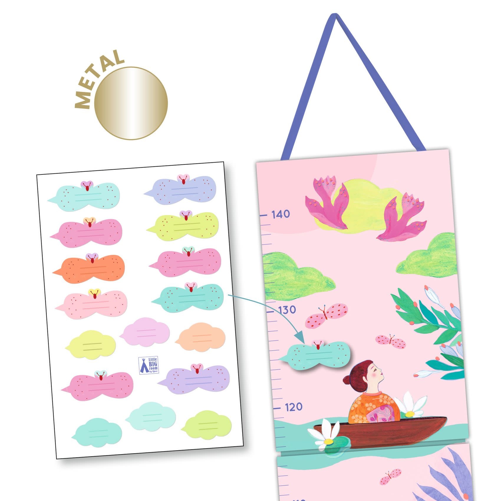 Een grote wandkaart met veel verplaatsbare stickers voor een wandeling langs het meer. Een mooi decoratief object, ideaal voor het meten van kinderen in de loop van de tijd (tot 1,40 m). En als het kind volwassen is, bewaren we het in een mooi doosje als mooie herinnering.
