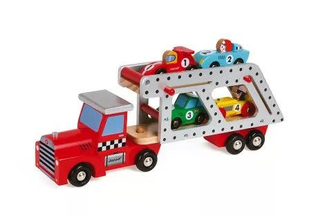 Een voertuig dat andere voertuigen vervoert: voor de kleintjes is het altijd indrukwekkend om dit soort vrachtwagens tijdens een ritje op de weg te zien. Hier is een kleinere die fans van auto's en racewagens van alle soorten zal bekoren! Met zijn gemakkelijk te hanteren oprit biedt deze houten vrachtwagen op elk niveau plaats aan twee raceauto's, d.w.z. 4 auto's (1 rode Formule 1, 1 blauwe Speed, 1 groene Roadster en 1 gele Retromotor) om op de vrachtwagen te vervoeren of om mee te spelen afzonderlijk. Om de oprit naar de achterkant van de truck te laten schuiven en de deur open te laten gaan, trek je eenvoudig aan de kleine rode hendels. Deze mooie vrachtwagen zal autoliefhebbers met een grote fantasie vanaf 2 jaar bekoren!
