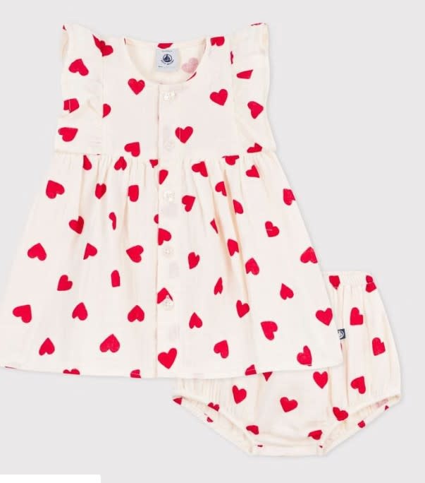Katoenen babyjurkje met hartjesprint en pofbroekje - Ecru/rood
