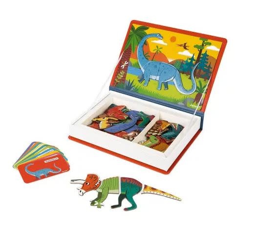 Ken jij het Magnéti’boek? Deze draagbare en educatieve magnetische boeken zijn geliefd bij jong en oud! Het principe? Een magneetdoos bevat veel magnetische elementen die je kunt combineren door de modellen te volgen of je creativiteit te laten spreken! Dit kartonnen spel neemt kinderen vanaf 3 jaar mee in de wereld van dinosaurussen dankzij 40 magneten en 10 kaarten met de naam van de dinosaurus in het Latijn. Zodra het boek is geopend, is het doel van het spel om op de magnetische scène de dinosaurus te reconstrueren die op de kaart staat aangegeven met behulp van de magneten. Het kind kan zich ook vermaken met het mixen van de verschillende onderdelen om nog engere wezens te creëren, aangezien ze allemaal uitwisselbaar zijn! Hiermee kan het kind zijn verbeeldingskracht en fijne motoriek verbeteren. Dit product is gemaakt van FSC®-gecertificeerde materialen en gecontroleerde materialen.