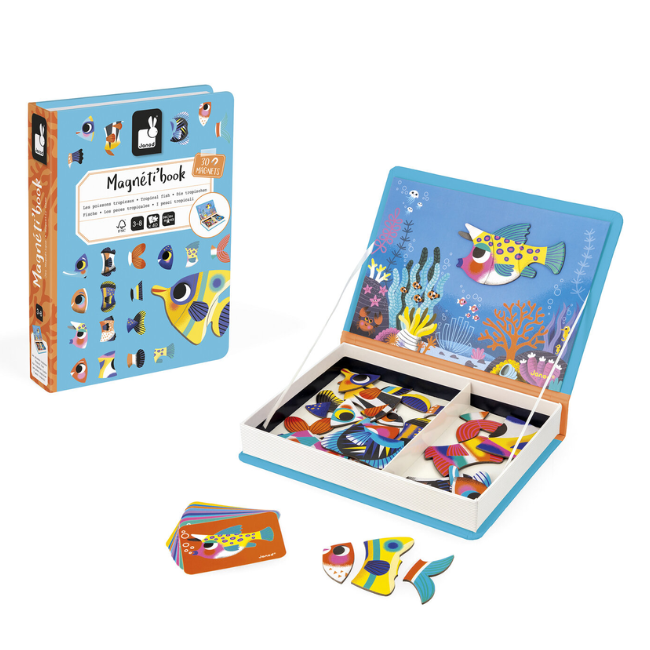 Roze, blauw, groen... Ze zijn er in alle kleuren! Duik erin en ontdek deze levendige tropische vissen! Dit magnetische spel bevat 30 magneten en 10 kaarten. Het doel van het spel is om de vissen op het magnetische bord na te maken door de voorbeelden op de kaarten te volgen. Je kind kan prachtige, kleurrijke vissen creëren! Perfect voor het ontwikkelen van observatievermogen en hand-oogcoördinatie. Met dit magneetboek kun je de magneten combineren en de creativiteit van je kind de vrije loop laten om nieuwe vissen te maken. Een magnetisch educatief spel gemaakt van FSC™-gecertificeerd karton.