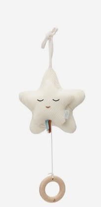 Shop deze mooie muziekhanger Star laat je kleintje genieten van de mooie klanken van het liedje lullaby van Schubert. Deze sterren in de vorm van een grote en een kleinere ster is voorzien van kleurrijke koordjes, geborduurde oogjes en een trekkoord om het muziekje mee te starten. Te leuk bij het bedje of de box.