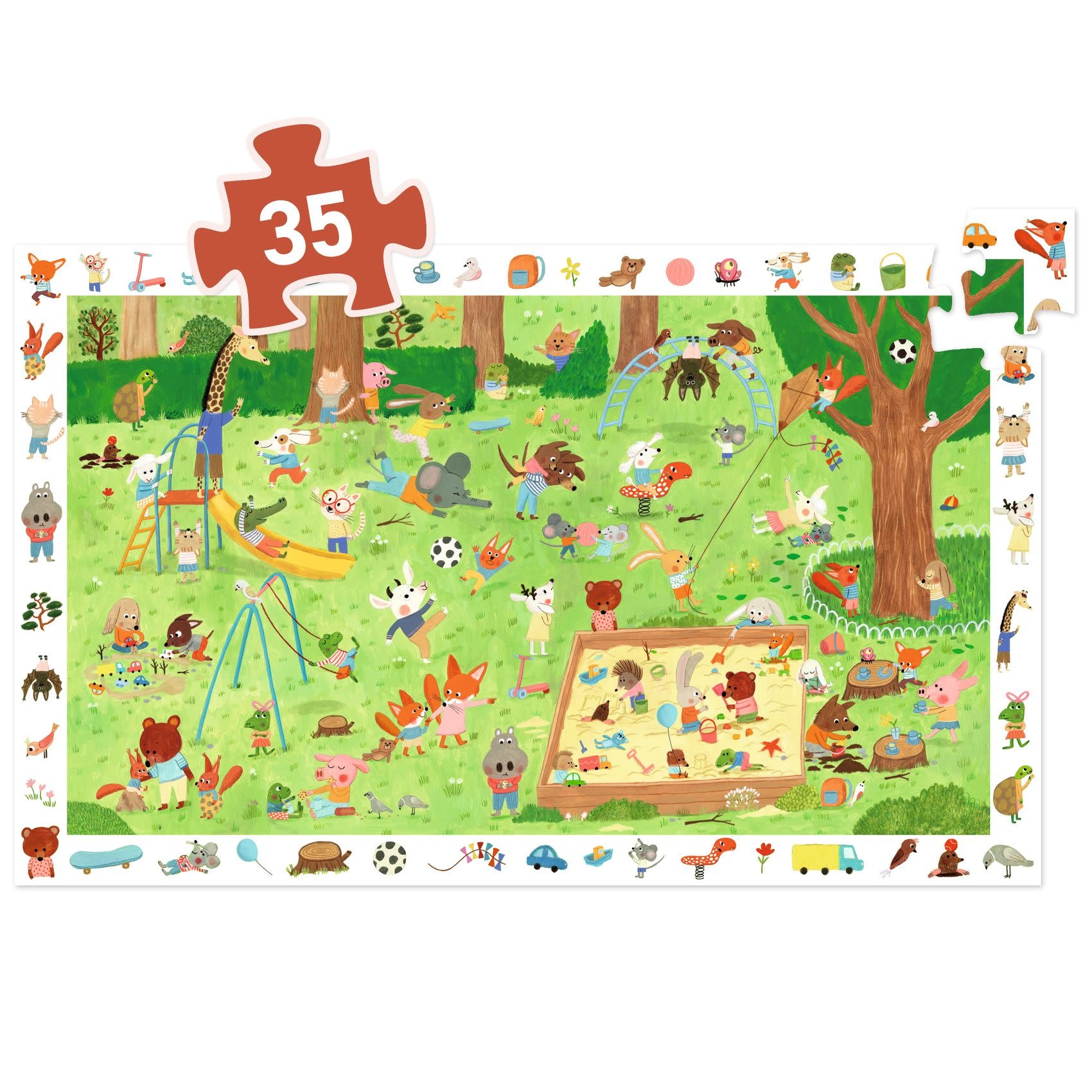 Een observatiepuzzel van 35 stukjes om kleine vriendjes te ontdekken die zich vermaken tijdens een middagje in het park. Het kind maakt zijn of haar eigen puzzel en kan vervolgens op een leuke manier de elementen van de kader in de afbeelding zoeken.