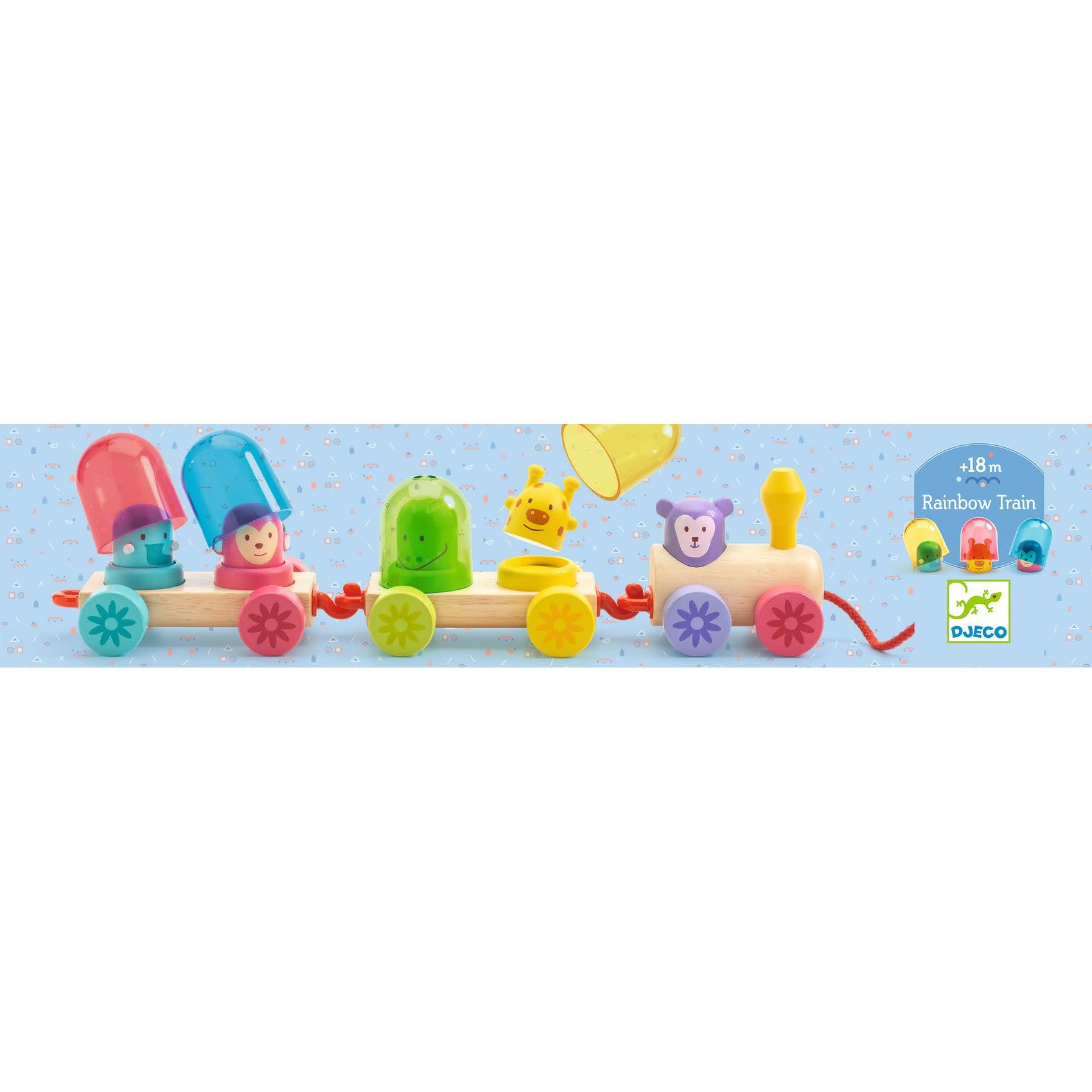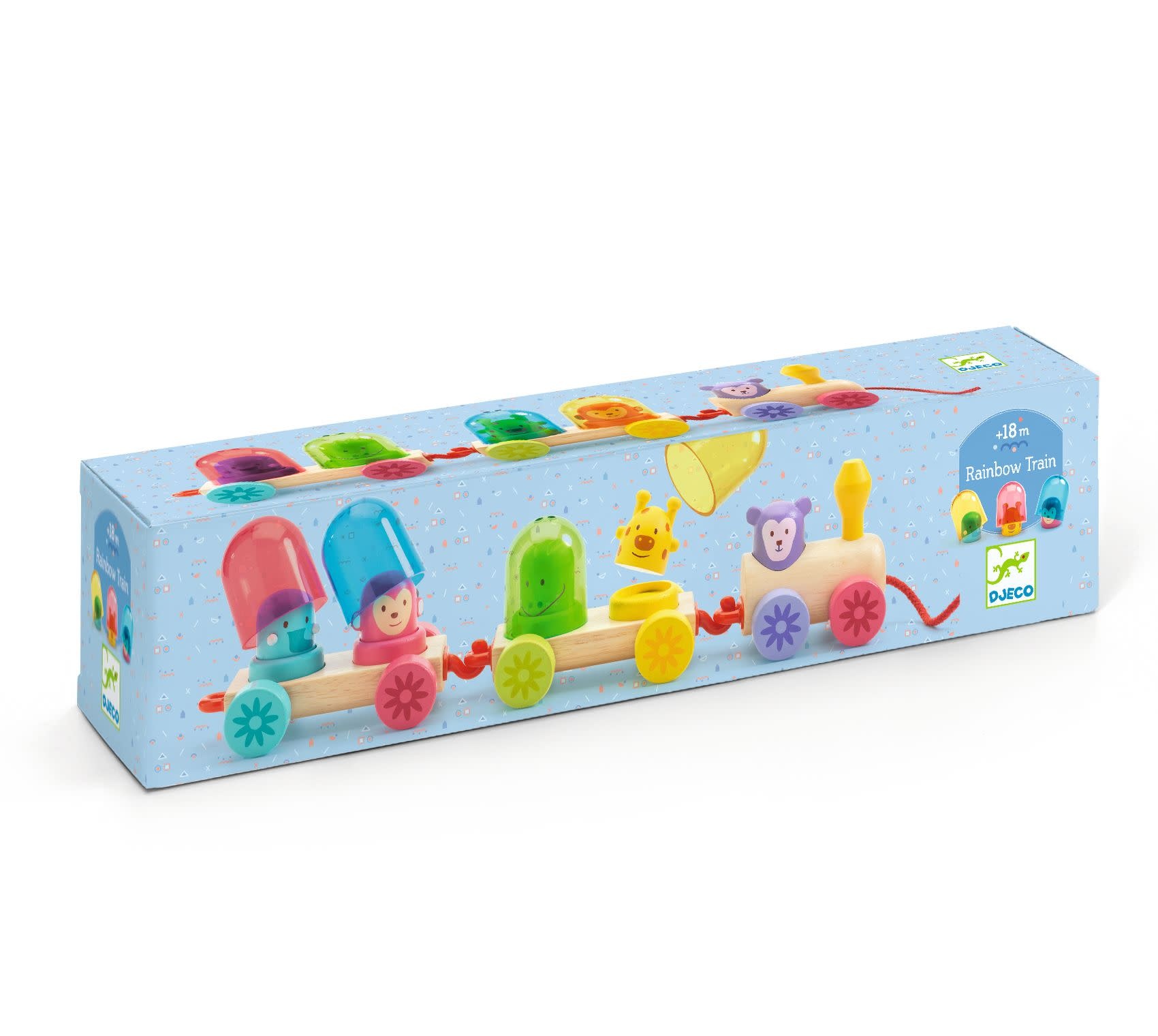 Een kleurrijke houten trein die het kind naar eigen fantasie in elkaar kan zetten en 3 gekleurde doorschijnende bellen waarmee hij de kleurenmengeling kan ontdekken. Zodra de trein in elkaar is gezet, kan het kind hem met behulp van het vetersysteem in beweging zetten.