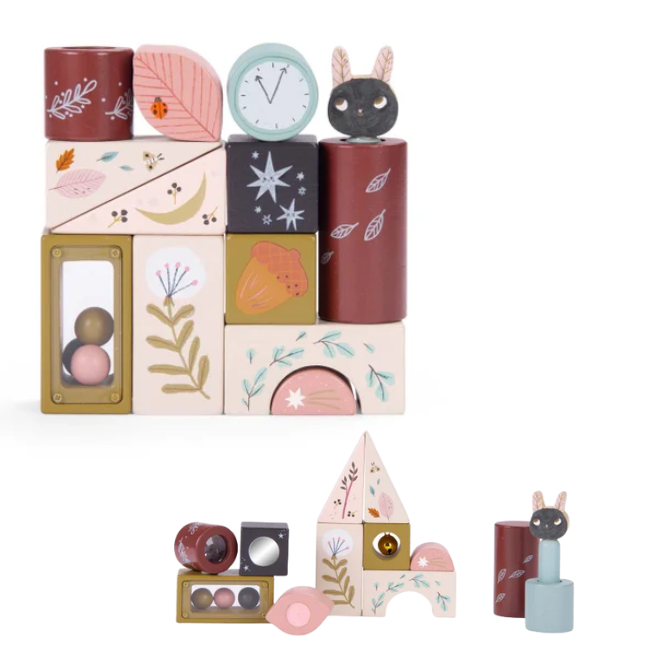 Geïllustreerde houten activiteitenset uit de After the Rain-collectie, bestaande uit 13 onderdelen in verschillende vormen met een spiegeltje, belletje, pop-up en kleine kraaltjes. Het ontwikkelt de motorische vaardigheden van het kind en leert hen over vormen en kleuren.