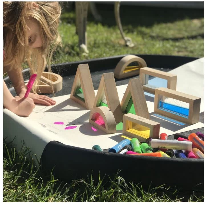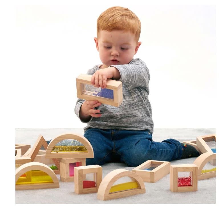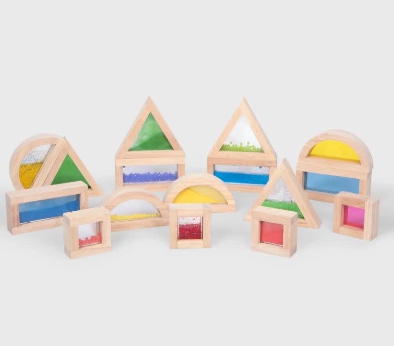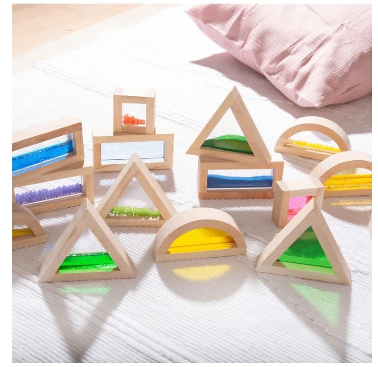 Tickit ® Sensory Blocks zijn rubberhouten blokken met verschillende vormen die een verscheidenheid aan sensorische centra bevatten, zoals kralen, transparant acryl, gekleurd zand en glinsterend water. Kleurrijk en tactiel, uw kind zal het geweldig vinden om de verschillende geluiden, bewegingen en kleuren te ontdekken terwijl het licht door de vormen schijnt en hun interesse en nieuwsgierigheid prikkelt. De veilige, gladde houten buitenkant en het felgekleurde sensorische centrum maken deze blokken perfect voor kinderen vanaf jonge leeftijd. Ideaal om te leren over vormen en kleuren en om observatievaardigheden te bevorderen, bijvoorbeeld alle driehoekige blokken zijn groen, enz. De blokken hebben dezelfde grootte als onze grote spiegelblokken (73376) die in combinatie met deze set kunnen worden gebruikt.
